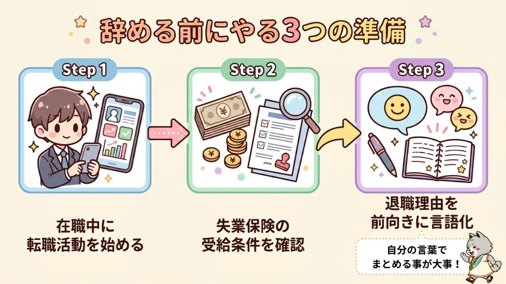 - 辞める前の3つの準備:①在職中に転職活動を始める ②失業保険を確認する ③退職理由を言語化する