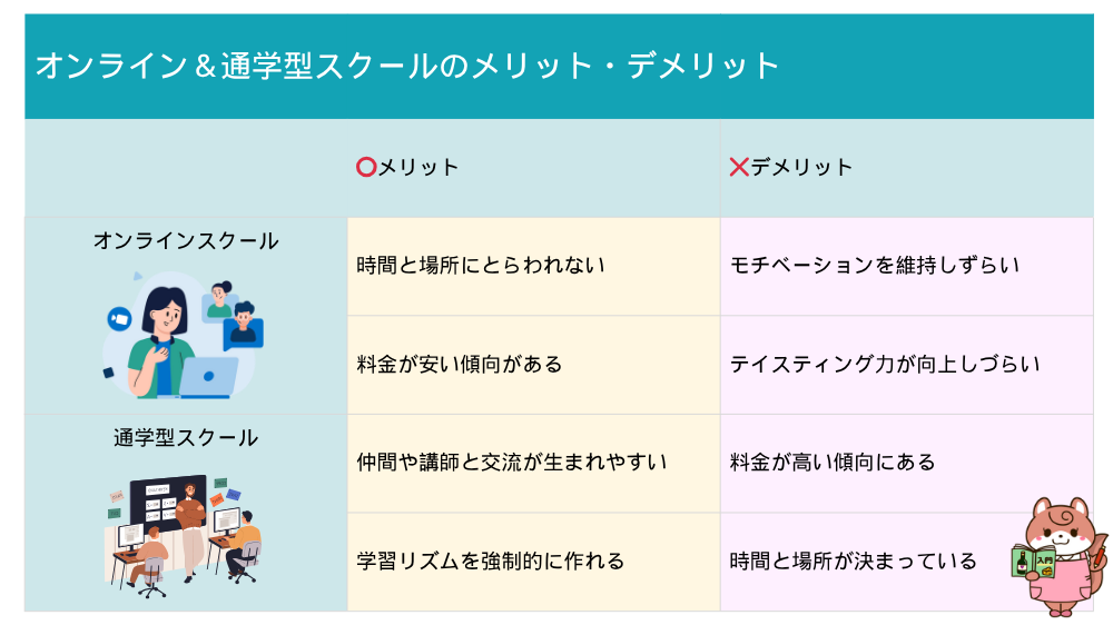 自分の求めている授業スタイルに合わせて、ワインスクールを探してみましょう。詳しくは、「オンラインスクールと通学型スクールのメリット・デメリット」で解説しています。