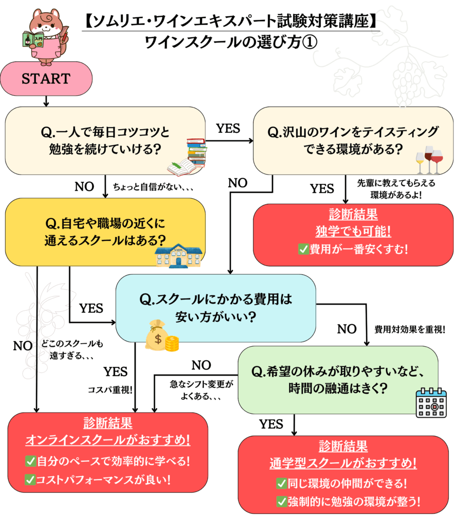 そもそもワインスクールに通うべきかを悩まれている方は、こちらのフローチャートで自己分析をしてみてください。