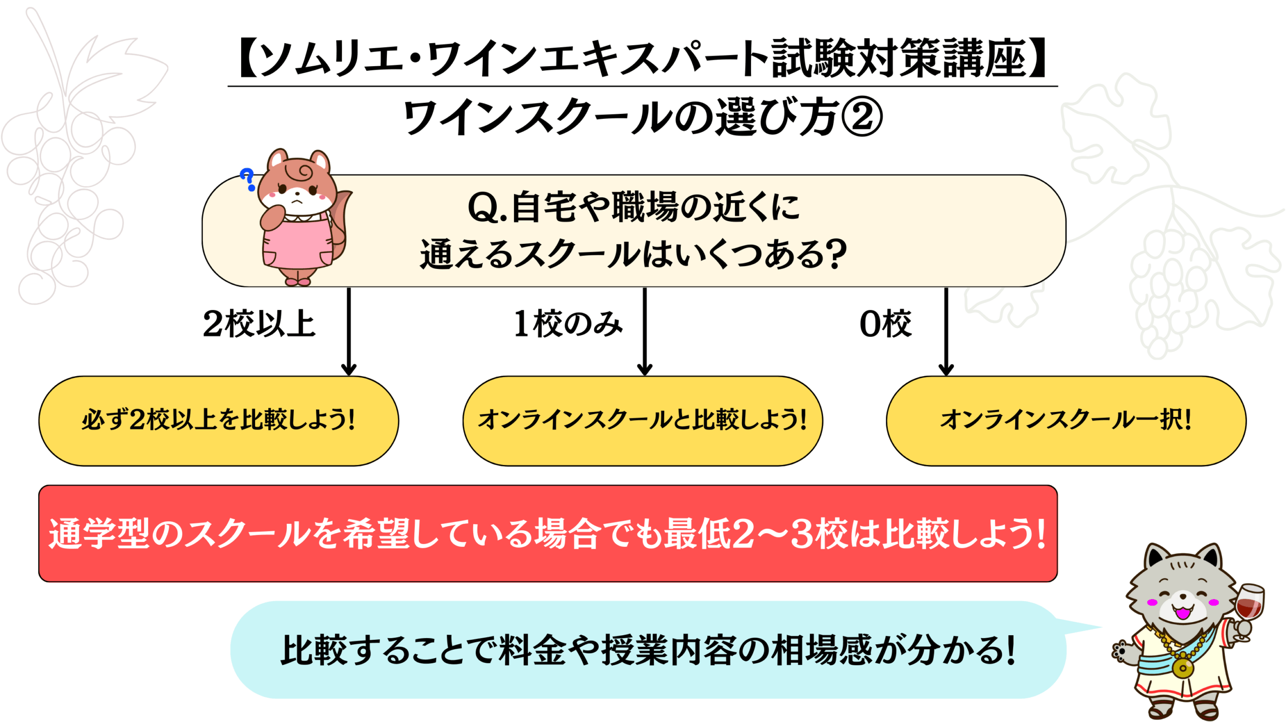 通学型スクールは、通いやすい場所にスクールがあることが大前提。自宅や職場の近くにワインスクールが無い場合は、オンライン一択です。