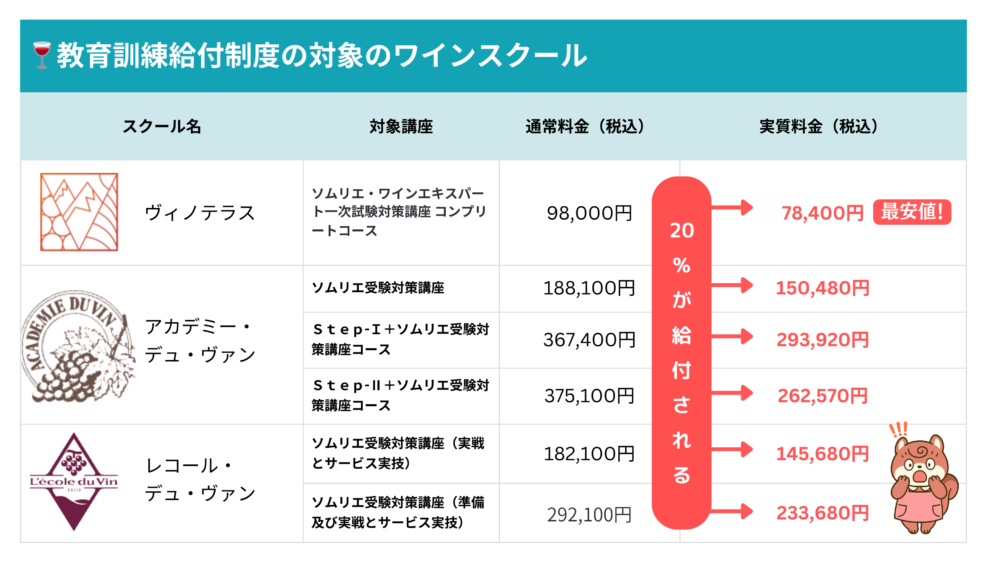 特に、オンライン特化型ワインスクールのヴィノテラスは、他社に比べて料金がもっとも安く、2025年から教育訓練給付制度にも対応し、一定の条件クリアで20%の給付金も受けることができます。