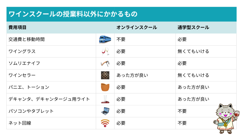 オンラインスクールを選択した場合は、ワイングラスなど、備品の購入費用が増えます。